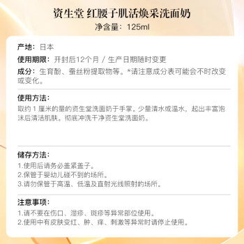 SHISEIDO(资生堂)是日本著名化妆品品牌,由福原有信于1872年创立。其产品包括护肤,彩妆,美发,香水四大系列。用资生堂洁面泡沫净化肤色。适用于所有类型的皮肤,这款泡沫清洁剂温和地去除脸上残留的污垢、碎屑和杂质,同时促进更光滑、更容光焕发的面容。强力洗面奶注入了各种滋养成分,有助于彻底清洁皮肤,而不会去除必要的水分。大米胚芽油源自世界上最古老的栽培作物,以其强烈的保湿特性而闻名,它可以为口渴、暗淡的肤色补充水分,达到明亮、柔软的效果。微白色粉末与白色粘土一起战斗,迅速捕获杂质,使皮肤看起来干净清新。发泡成丰富的奶油泡沫,这种澄清配方溶解辉光黯淡的表面细胞、日常污垢和污染物。洗面奶使皮肤焕然一新,滋润柔软、优雅和有弹性的肤色。