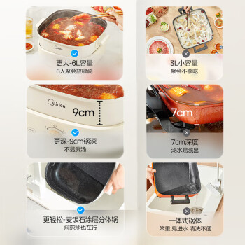 给我两首歌的时间,8分钟速沸。6L嗨聚大容量,给欢聚超长续航。刷/煮/煎/炒/炖/焖,高能解馋真有料。分体式锅体,整锅轻松端上桌。食品级麦饭石不粘涂层工艺 抗菌涂层,抗菌不留异味,嗨吃安心。