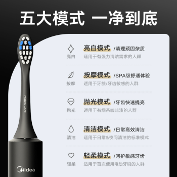 Midea 美的 SS 电动牙刷 曜石黑。300天超长续航 出行的理想伴侣 ,轻柔模式下,每次2min,每日2次。高频震动马达,动力强劲刷的干净。五档清洁模式 多场景不同需求适用。专业杜邦刷丝 顶部磨圆更护龈。双键灵活操作 开关换挡高效快捷。