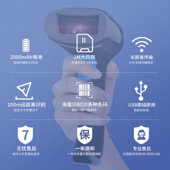 读码速度达到100次,秒扫描速度更快,识别率更高,智能无线2.4G双向传输数据传输,信号强,穿透绕射能力强,无障碍物及信号干扰情况下,传输距离约100米,32位高性能芯片,解码能力强,能识别市面上,大部分的一维维码,扫码就是快,采用优质镭射激光头,更快更灵敏,快速一维码满足市面上大部分条码扫描的使用需求。
