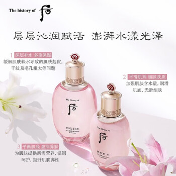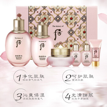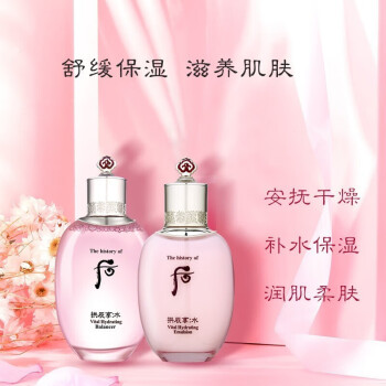 WHOO后是*级护肤品牌,属于LG健康生活旗下,融入了传统宫廷护肤配方及中医护肤医学,其使用效果好,感受细腻获得了大量的好口碑,在中国的人气日渐高涨,也是很多出国游购买的护肤品首选品牌。WHOO后水妍系列是WHOO后最补水最清爽的一套。这个这款水乳套装含有净化皮肤的白金纳米水和银河水,采用红华肌丹与清气益寿丹等宫廷配方,能充分给肌肤补水,使皮肤恢复湿润柔嫩的状态。套装包含水沄平衡爽肤乳110ml,水沄平衡爽肤水150ml,水沄面霜20ml,水乳小样各一支20ml,水分面膜30ml。