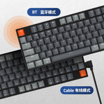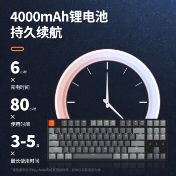 配列方面:采用87键位(80%)配列布局,没有数字小键盘。键帽方面:ABS镭雕字符键帽,字符清晰,手感比较柔和。轴体方面:采样佳达隆机械轴连接方面: 支持“有线模式、蓝牙模式”两种连接方式,可同时连接三个蓝牙设备。续航方面:内置4000mAh超大容量锂电池,充电6H,使用80H,最长使用时间3-5周。其他方面:一键切换多种灯光效果,两段式脚撑设计,可替换ESC键,支持USB/type-c连接。