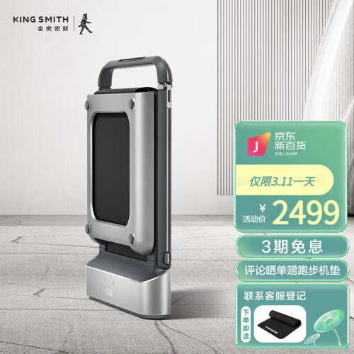 KINGSMITH 金史密斯 WalkingPad R1 可折叠平板跑步机,采用金史密斯家族史可折叠平台专利技术,可将跑步平台180度对折,直立放置,厚度15cm,占地面积不足0.2平米。一机两用设计,可根据需求扶手可以收纳;无刷电机,减少噪音,耐用性和稳定性更好;三种方式操控,遥控器、脚感控速、APP控制。