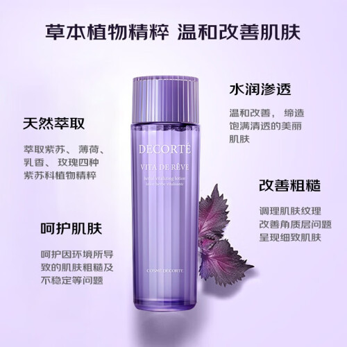 COSME DECORTE 黛珂紫苏保湿水,添加了紫苏科植物精华,对换季敏感或者受环境侵害的肌肤提供呵护,维持肌肤稳定。曾在2006-2009年四年入选过COSME大赏。无合成界面活性剂、无油分、无酒精,敏感肌肤也适用。牛油果天然植物乳液,紫苏水好搭档,被称为“森林的黄油”,营养价值非常高的牛油果、和其他果实及植物中抽出4种天然植物精油配合的柔肌乳液。白色轻薄乳液质地,流动性很强,使肌肤充满水润感。早晚2泵化妆棉擦拭,吸收非常快,20秒不到就能被全部吸收。