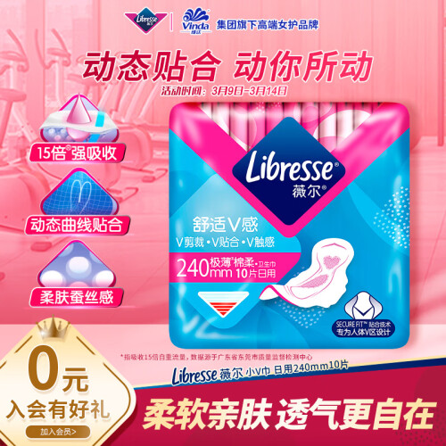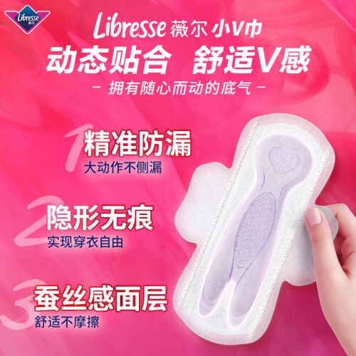 Libresse 薇尔作为女性卫生用品品牌,首创 SecureFit贴合技术,动态贴护女性V区不移位。在欧美家喻户晓,备受时尚达人青睐。迄今为止,Libresse 薇尔靠实力行走全球101个国家,拥有超过2亿女性忠诚用户。V剪裁:圆头小腰倒V尾,不变形;真正符合女性V区的立体剪裁,重新定义舒适;V贴合:动态曲线贴合,不移位;基于上万组女性曲线数据,独创曲线贴合专利*技术;V触感:蚕丝感面层,更细腻;专为女性打造的亲肤面层,时刻呵护你的娇嫩肌肤。