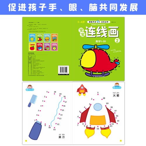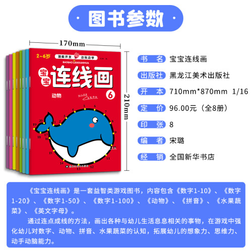 《宝宝连线画》是一套益智类游戏图书,全套共八本,内容包含《数字1-10》、《数字1-20》、《数字1-50》、《数字1-100》、《动物》、《拼音》、《水果蔬菜》、《英文字母》,通过连点成线的方法,画出各种与幼儿生活息息相关的事物,在游戏中强化幼儿对数字、动物、拼音、水果蔬菜的认知,拓展幼儿的想象力、思维力、动手动脑能力。