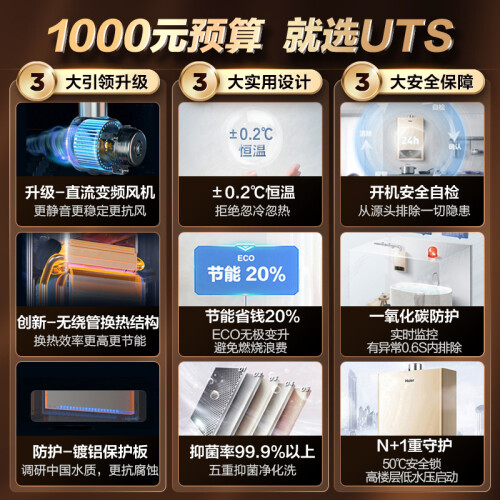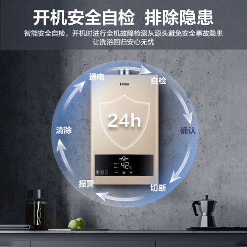 Haier 海尔 JSQ30-16UTS(12T) 燃气热水器 容量为16L,水气双调恒温,能够将水温差控制在±0.5℃左右,避免忽冷忽热。支持智能分段燃烧,三段火力可自动切换,能够根据不同季节自动调节。内置56重安防措施,支持漏电保护、气路保护、智能防冻等功能。搭载CO超标防止装置,实时监测CO情况,超标自动切断气阀。支持低水压启动。尺寸:540*370*145mm。