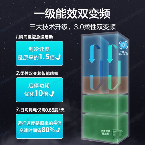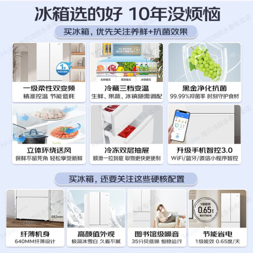 【全新一级柔性双变频】0.65度/天,节能低耗;35分贝低噪,恒稳运行;低耗实力派,双循环双变频,节能环保“芯” 【独立三档变温】生鲜、果蔬、冰镇,三种储鲜模式匹配不同食材所需,美食生活轻松拿捏。 【健康黑金净味】物理活性成分高效抑菌、除异味,抑菌率99.99%,净味率≥95%,时刻守护食材清新储鲜环境。 【360°立体环绕送风】立体环绕送风,制冷均匀,保鲜食材不留四标,轻松享受生活舒适。 【手机智控3.0】连接海尔智家APP,新鲜状态随时掌握,指尖轻触美味达成。蓝牙连接,3秒速联,支持微信小程序连接。 【抽屉式收纳】冷冻双层直开抽屉,顺滑一拉到底,取物更快更便利。 【纤薄机身】640mm纤薄设计,灵巧融入橱柜“隐身”不占地,小厨房内轻松摆。 【极简冰雪白外观】来自阿尔卑斯山巅的白色,纯净而神圣 以不露声色的高级美百搭家居,平静美好。