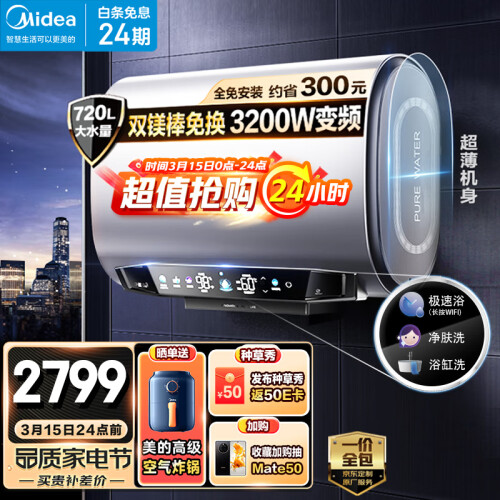 美的 F6032-UD(HE) 储水式电热水器,拥有60L大容量,长度仅为790mm,比普通50L热水器还省空间。内置创新稀土镁棒,上下胆各配置一个,寿命延长至4倍,实现终身免更换。采用六层净滤系统,深层杀菌用水更卫生,杀菌率高达99.99%。双管式2200-3200w变频速热,一键开启浴缸洗,实现12倍MAX增容。6层VIP真空保温,锁温时长达93小时,更省点节能。NFC智能感应,手机一贴即可断电,还可随时操控温度。