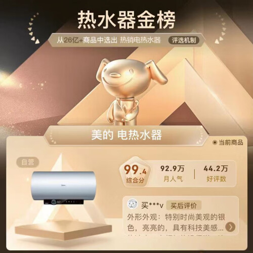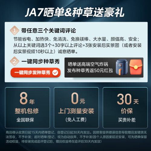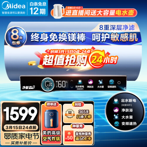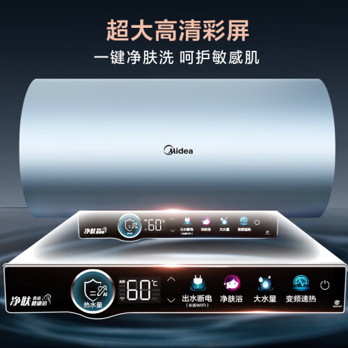 美的 JA7系列 储水式电热水器,带有长效镁棒,内置AI芯片,智能识别水质,根据状况动态调节镁棒消耗速度,从而大大延长镁棒使用寿命,真正实现免换镁棒。3200W/2100W变频速热随意切换,最大实现7倍增容,可利用峰谷夜电自动加热,符合一级能效标准。8重过滤深层杀菌阻垢,80℃高温杀菌+银离子管路抑菌,实现99.99%的除菌率。多项用水安全设置,漏电提心,出水断电,加长防电墙沐浴更放心。可以接入美的美居APP,可用智能语音操控,并与其他智能设备联动。