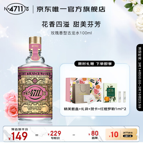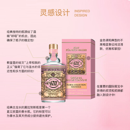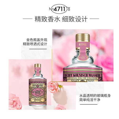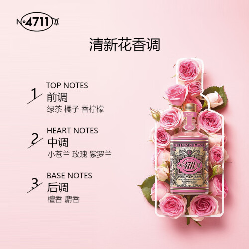 4711是德国科隆著名的化妆品集团,公司名称来源于拿破仑横扫欧洲时留下的门牌号。这款Rose Eau De Cologne Spray是男女皆宜的木质花香,清新,甘甜,绿色,明亮,脂粉,活泼;前调:绿茶,柑橘,佛手柑;中调:玫瑰,小苍兰,紫罗兰;尾调:檀香,麝香。