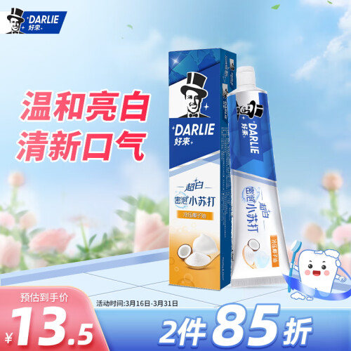 DARLIE 黑人牙膏是在超市常见的品牌,产品也比较受认可。超白系列牙膏,含有亮白因子和矿物盐,美白防蛀,含竹炭微粒,气味清新。