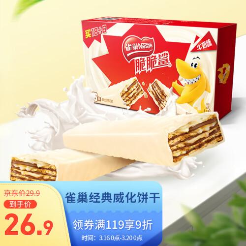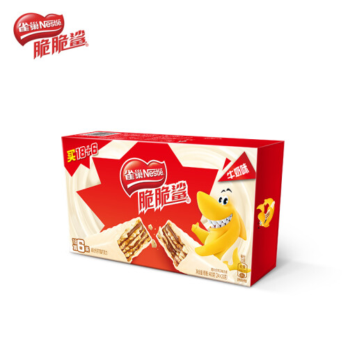 雀巢脆脆鲨牛奶味巧克力威化,由进口乳粉、美味香滑的雀巢巧克力,包裹着松脆的威化夹层而成,零反式脂肪,酥脆香甜。