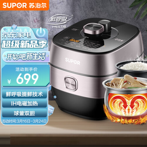 SUPOR 苏泊尔 SY-50HC8033Q 电压力锅 5L,采用优质的球釜内胆设计,食用级304精钢材质,导热更均匀快速,更好的锁住食材的鲜美与营养成分,使口感更香浓细腻。一键式的烹煮功能,操作更简单方便。循环交替加减压,呼吸吐纳,释放食物本身鲜味。1300W IH大火力加热,顶置触控,不弯腰操作。