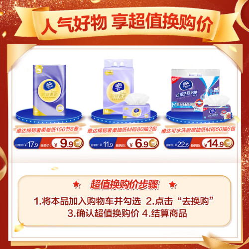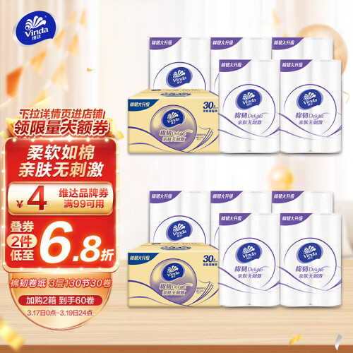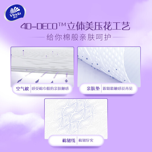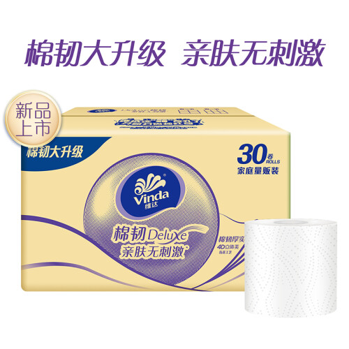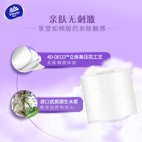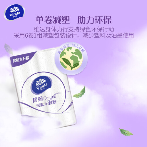 感受棉巾般的亲肤触感,间隙间充盈空气触感柔软,跟粗糙触感说再见,数百立体绒点温和亲肤,棉韧结合拉扯不易破,网状结构不掉纸屑,维达身体力行支持绿色环保行动,采用6卷1组减塑包装设计,减少塑料及油墨使用。
