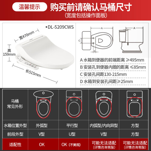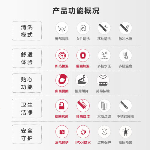 此款智能马桶盖,主打一秒速热、恒温畅洗,产品采用日本原装进口PTC陶瓷加热器,冷水一入热水即出,可持续供应温水;每次如厕前喷嘴自动清洁,便圈3D曲面舒适弧度设计,提供舒适坐感同时支持智能3档调温;支持移动清洗、温水清洗、脉冲水流,盖板方便脱卸,日常清洁无压力。产品尺寸:515*470*159mm。