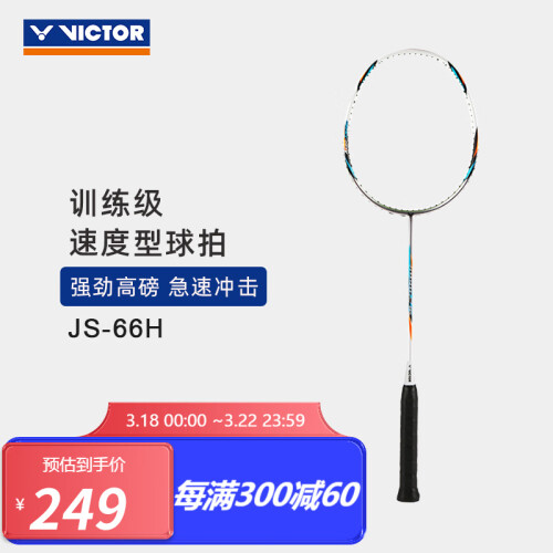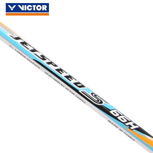 VICTOR 威克多 JS-66H A-4U 全碳素羽毛球拍 单拍,导入强叠层系统,有效增强拍框刚性,可承受高磅数压力,高性价比速度类球拍。根据空气流体动力学原理,巧妙运用菱形及椭员形破风框形特性,剑锋般的拍框可快速引导空气,椭圆框可减少空气阻力。融合两项框型的特点,加快球拍回击的速度,提升球拍的敏捷性。
