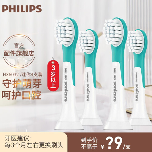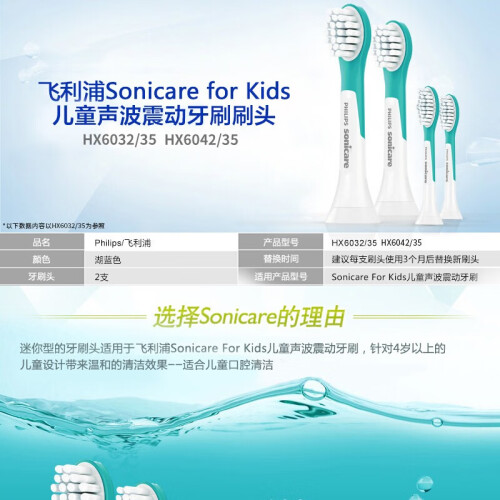 这款PHILIPS飞利浦HX6032电动牙刷替换头,尺寸适合儿童口腔,刷毛柔软,能有效清洁。。建议每3个月更换一次。适合4-7岁儿童使用。从美亚客户的评论来看,是比原装刷头要小一点,原装的可供12岁大童使用的。所以购买时,还请注意孩子的年龄。