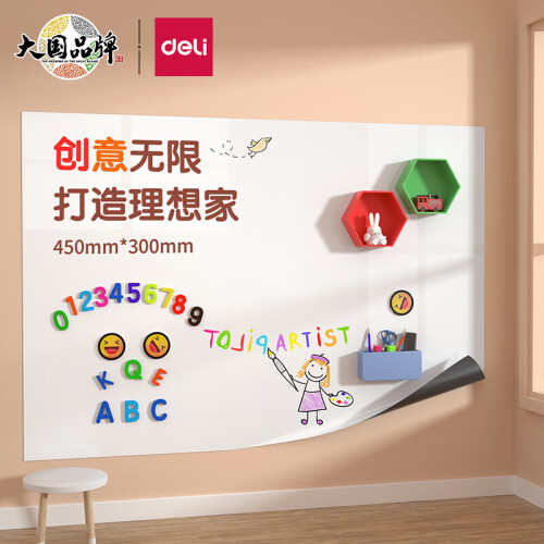 deli 得力 50120 软磁铁自粘白板贴,此款规格为45*30cm,打造“亲子家”、学习小天地,拥有不枯燥的学习方式,父母陪伴教育,增加互动激发孩子的学习兴趣;此款白板贴保持墙面整洁,给孩子一片自由天地,通过涂鸦发散孩子思维,激发孩子创意灵感;支持剪裁,发挥宝宝创造力,拓展空间想象力,墙面即风景,随时创造出属于宝宝的专属墙面,可贴于诸如墙面、玻璃、光滑木表面、白板或者黑板等多种表面。