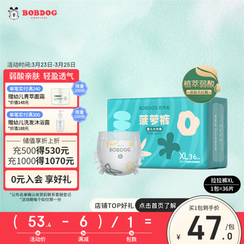 巴布豆纸尿裤是巴布豆(中国)儿童用品有限公司家族畅销产品之一,2012年巴布豆推出婴儿纸尿裤系列产品,以“给宝宝舒适的体验”为产品理念,在吸收性、干爽性、透气性、柔软性等各方面,综合提升了纸尿裤产品的舒适性。旗下系列比较丰富,有菠萝系列、飞帆系列、梦初语系列、超柔系列、特薄系列等,BoBDoG 巴布豆 菠萝系列 拉拉裤,弱酸配方,贴近宝宝肌肤天然H值,帮助维持皮脂膜表面平衡值,保护屁屁健康,高分子魔力吸水珠,薄薄一片牢牢锁住7次尿量,超低返渗,阳光干爽。