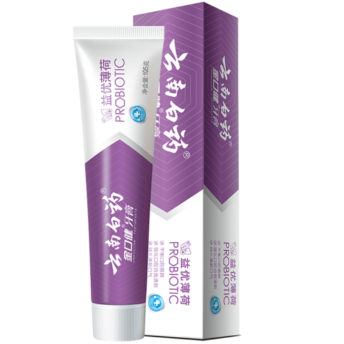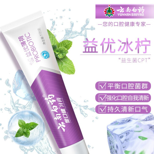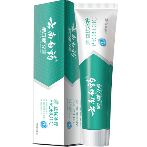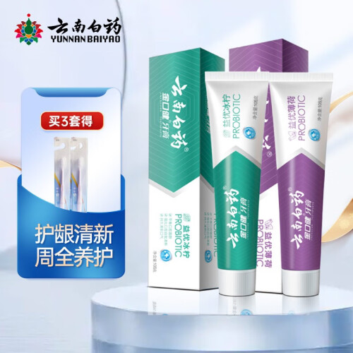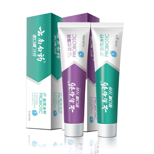 YUNNANBAIYAO 云南白药益生菌健康牙膏套装,内含激爽薄荷105g+薄荷清爽型105g,这款云南白药牙膏含有特有的药物活性成分,能促进牙龈血液循环,长期使用可以防止牙龈出血,预防牙周炎、牙龈萎缩等口腔疾病。