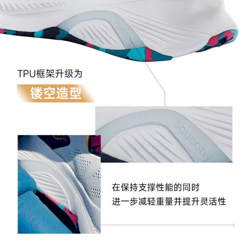 中底体积增加约18%,经过重新调教的PWRRUN材质,更柔软,更回弹。新中底侧墙加高形成环抱结构使脚感更稳固更舒适,底台造型更接近于SPEEDROLL理念,使步态更流畅TPU框架升级为镂空造型,在保持支撑性能的同时进一步减轻重量并提升灵活性。