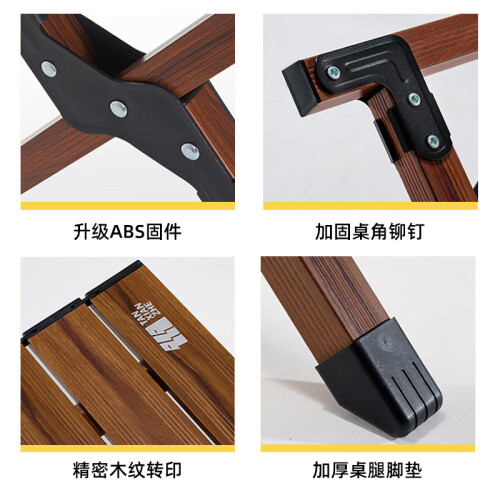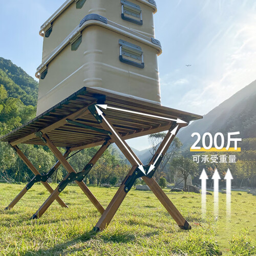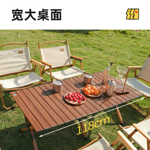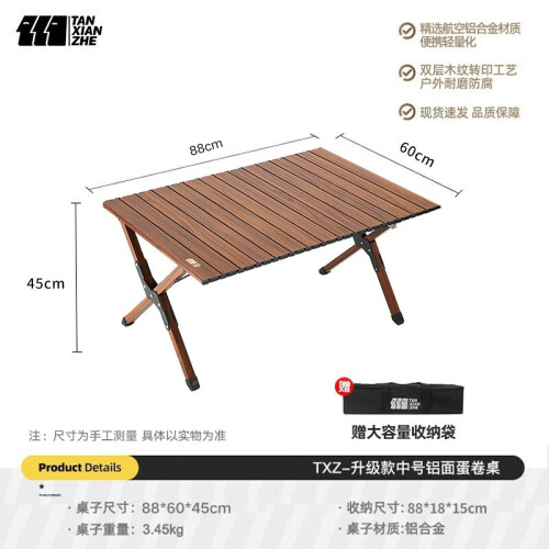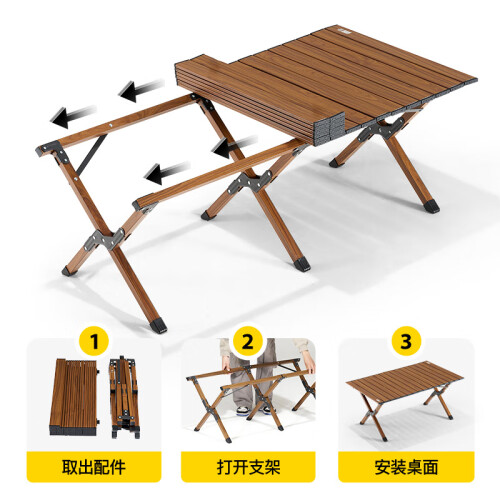 此款铝合金蛋卷桌,桌面和支架可分离,独立进行折叠收纳。承重高达100KG,满足日常使用需求,铝合金框架木纹工艺,美观实用。