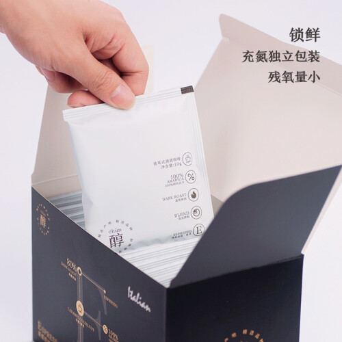 甄选南美黄金产区的阿拉比卡小粒种咖啡豆,品质稳定、口感明亮。高度烘焙后,酸味收敛,口感越发醇厚,榛果和焦糖的香气全面溢出,带来有层次的“苦”。规格:10g*20包。