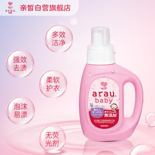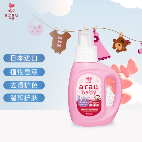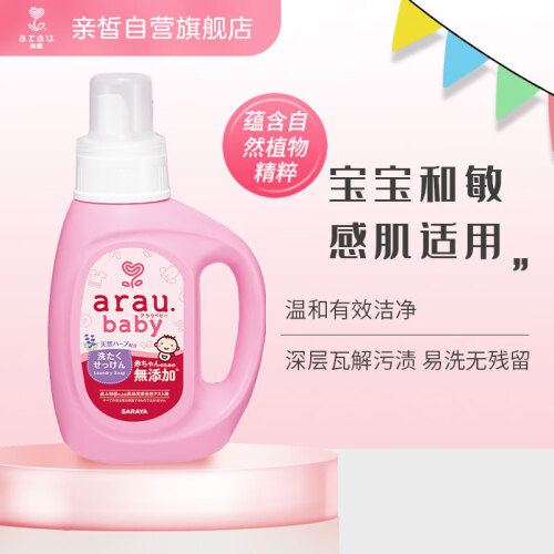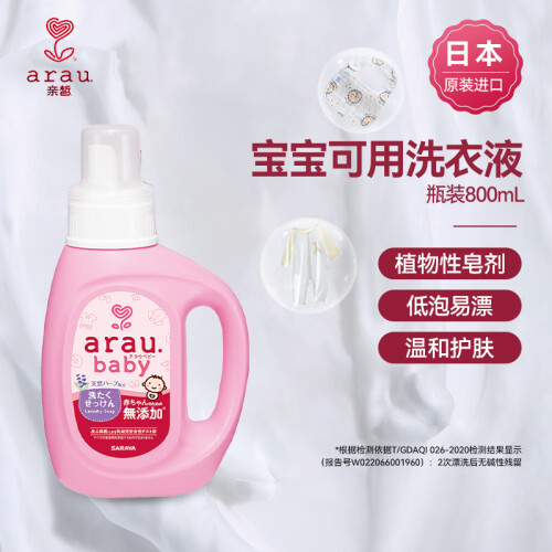 arau 亲皙是日本进口的母婴洗护品牌。这款洗衣液天然温和,柔顺舒适。其主要成分为皂液,含薰衣草和荷兰薄荷精油。天然的植物配方能快速地溶解洗净污垢。建议用于清洗婴儿衣服、尿布和敏感皮肤人士的衣服。规格为800ml。