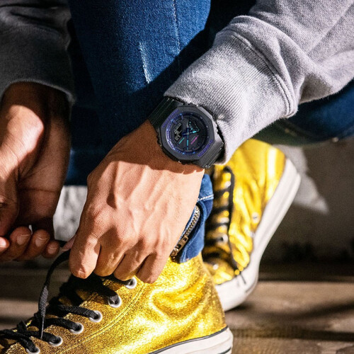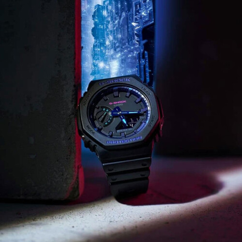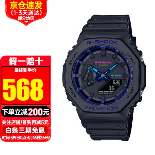 这款卡西欧 G-SHOCK系列型号为GA-2100,外观延续1983年发售的DW- 5000C经典DNA,释放年轻摩登的未来感。此外,GA- 2100系列选择了双显设计,矿物强化玻璃表镜,便于读时的同时又不失潮酷格调。融入碳纤维的精细树脂,将坚韧耐用与高刚性相融合,实现轻韧加持、耀目进化,不仅颜值出众,而且可靠实用,搭配石英机芯,表盘直径45.4mm,厚度仅为1 1.8mm,在保障了坚韧硬核性能的同时,更做到极简设计,也是目前G- SHOCK双显产品中较为轻薄的表款。支持200米防水,同时拥有全自动高亮度LED照明、全自动日历、世界时间、每日闹钟,整点提醒,防震、指针闪避以及倒计时等功能。