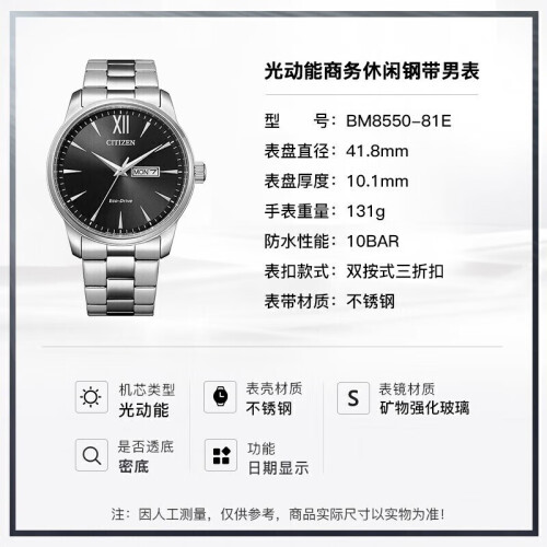 CITIZEN 西铁城 男士光动能腕表 BM8550-81E,让优雅更显纯粹,经历时间考验,仍然在腕上熠熠生辉,外在型格,内在心动,不因岁月而流逝,不因坚守而褪色,儒雅简约经典商务风格,送给恋人的腕表里,有一个藏着关于时光的秘密,防刮耐磨矿物强化玻璃,矿物强化玻璃,透光性好、硬度高、防刮耐磨,100米防水,日常洗手、溅水、以及一般水上运动不会影响手表使用。