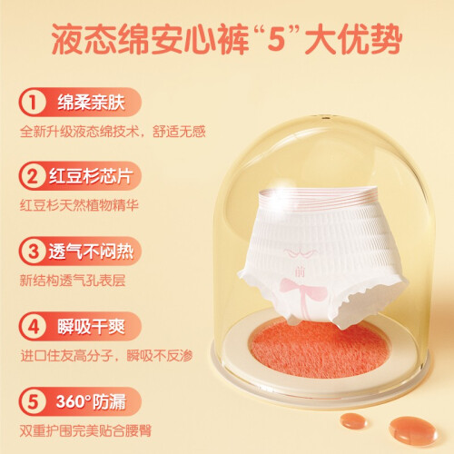 全新升级液态绵技术,舒适无感。红豆杉天然植萃精华,新结构透气孔表层,透气不闷热。进口住友高分子,瞬吸不反渗。双重护围完美贴合腰臀,全新升级液态绵技术,温柔呵护,一穿即爱。