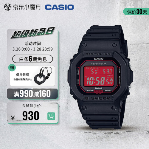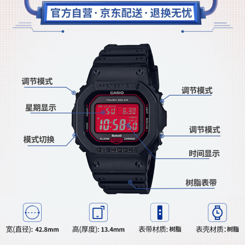 这款卡西欧(CASIO) G-SHOCK系列男表采用石英机芯,走时严谨,品质稳定;树脂表带经久耐用。拥有防震,全自动高亮度LED照明,每日闹铃、整点响报,全自动日历,倒计时等功能,200米防水,严格防水测试,高密度制作。纯黑的G-SHOCK,透过红色点缀散发满满的活力,持续散发强悍不息的品牌精神。
