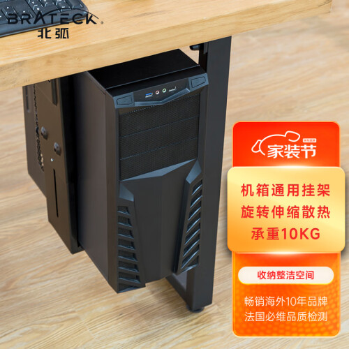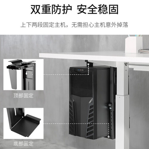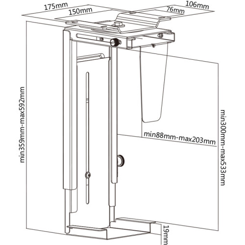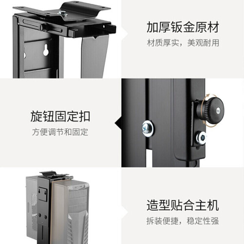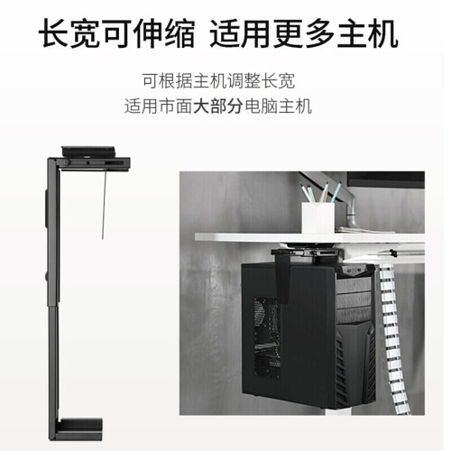 该托架尺寸为17.5*10.6*59.2cm,材质为高强度钣金,升降范围位300-533MM,宽度范围位88-203MM,旋转角度为360°,安装方式有桌底式、墙式,支持承重范围为0-10kg。