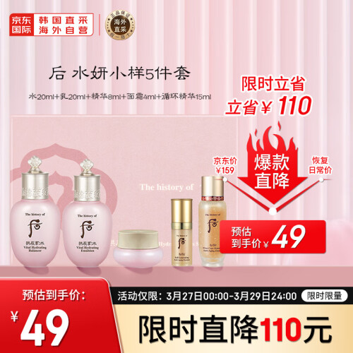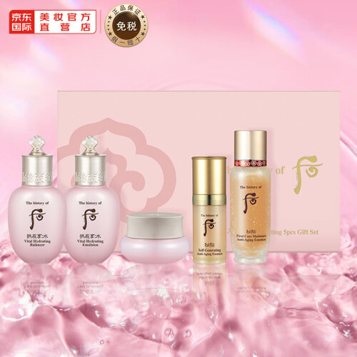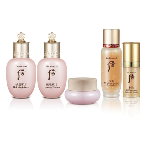 WHOO后是韩国高端护肤品牌,属于LG健康生活旗下,在中国的人气日渐高涨,也是很多人去韩国购买的护肤品首选品牌之一。这款Whoo 后拱辰享水研中样5件套,包括,拱辰享柔肤水20ml+拱辰享保湿乳液20ml+拱辰享面霜4ml+秘贴循环精华15ml+秘贴精华8ml,可以调节肌肤水油平衡,补充肌肤所需营养。