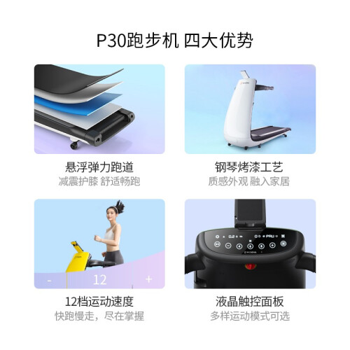 野小兽智能炫彩跑步机P30,美好不在将就,重启新生活。红点大奖、多彩夺目、在线私教、静音折叠、多色可选。多种直播课程类型、数字化人机交换、心率测试、折叠手把、液晶面板、运动水壶架、钻石纹跑台。搭载1-12km/h配速,具备澎湃动力十足,轻松跑酷,居家运动更舒适。采用四层悬浮减震的跑层结构,回弹性能优越,减少关节冲击,减轻脚掌震感,让你舒适畅跑。拥有舒适贴心的三档坡度调节功能,可以有效增加跑步时身体的倾斜角度,还原真实跑步体验。实现运动时间、距离、速度等数据实时监测查看,了解自身运动状况,调整运动节奏,科学运动。整机免安装设计,实现拆箱即用,女生也能快速上手,且机身可折叠,便于收纳,占地仅0.3m2,节省更多生活空间。