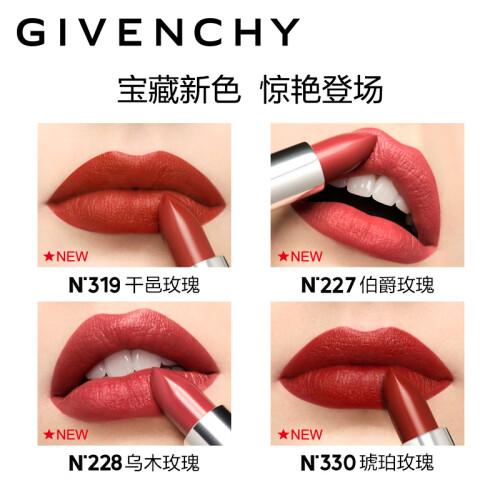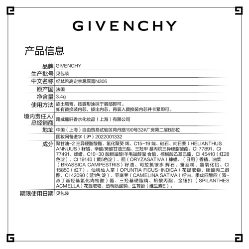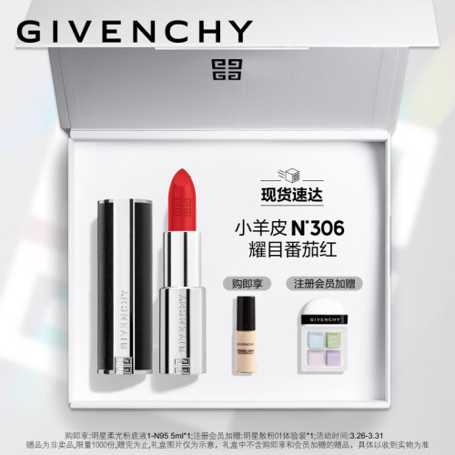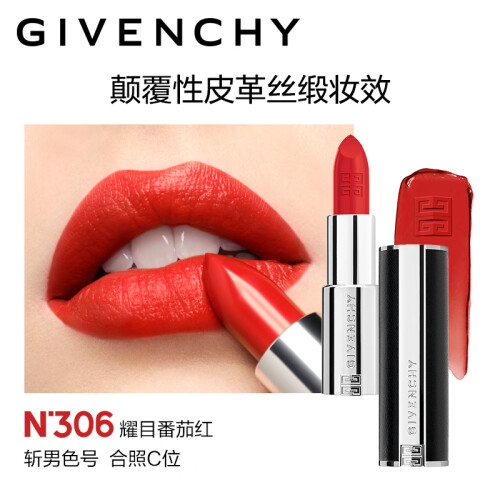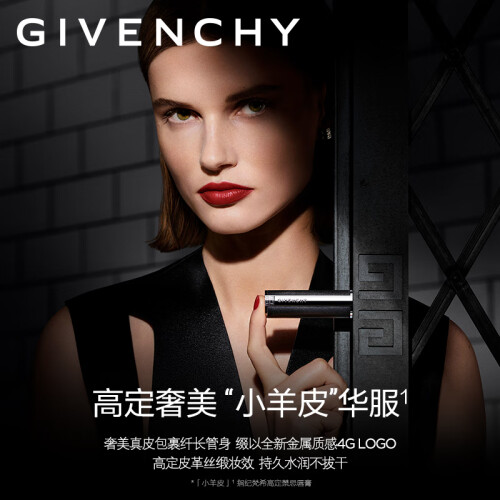 GIVENCHY纪梵希 高定香榭天鹅绒唇膏,昵称“小羊皮”,是纪梵希最受欢迎的口红。采用了小羊皮真皮定制外壳,银色管身点缀简洁利落的铆钉,灵感来源于纪梵希高定时装的设计理念。显色度饱和,天鹅绒丝滑质地,遮盖力强,高质感、浓厚色彩张力,基本能够还原膏体本来的颜色, 蕴含50倍玻尿酸和天然蜂蜡,颜色持久,深唇色人效果也能凸显。 适合任何肤质,不含刺激成分。热门色号有315、304、305、306等。