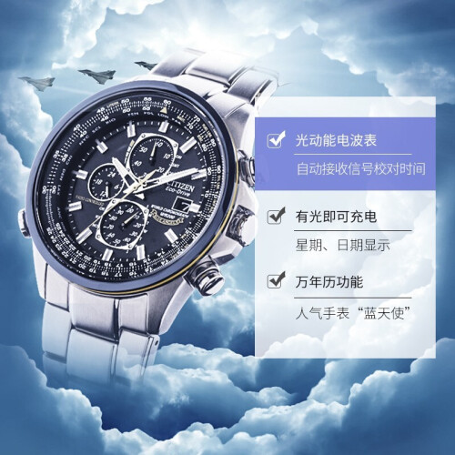 CITIZEN 西铁城 AT8020 男款腕表属于超级空中之鹰系列中的BLUE ANGELS蓝天使表款,从名字也能猜出,这是一款飞行员系列计时腕表。延续了空中之鹰粗犷豪放但不失细致的风格。这款腕表表壳经过蓝离子电镀处理,搭载Eco-Drive光动能机芯,任何可见光源的存在就能为其充电,满电后在无光环境也可提供2个月的精准走时,既环保又省事。支持世界26个城市电波自动精确对时(欧美日中),蓝宝石防刮水晶玻璃表镜,表盘宽度43mm,三眼计时功能,3点钟位置显示日期,200米防水。