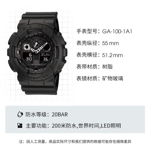 功能方面,G-SHOCK的耐冲击、防磁、防水200米。提供精准的计时,包括马赫指示器、1/1000秒码表、测量模式、速度等。另外还有常见的自动LED、闹钟、世界时间、万年历等。参数方面,表壳直径50mm、厚度16.9mm,内置电池可提供2年的标准使用时间。
