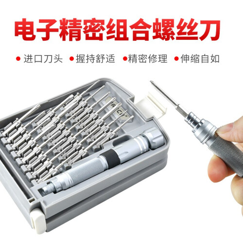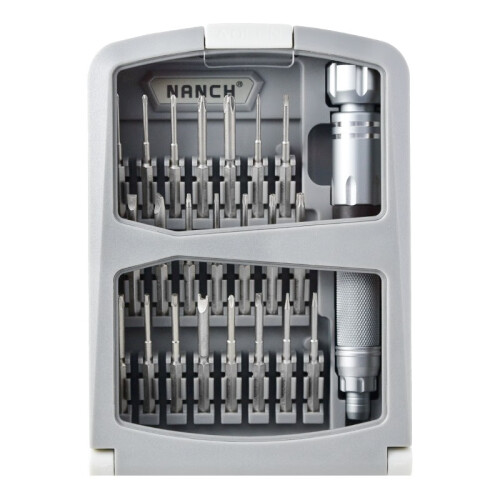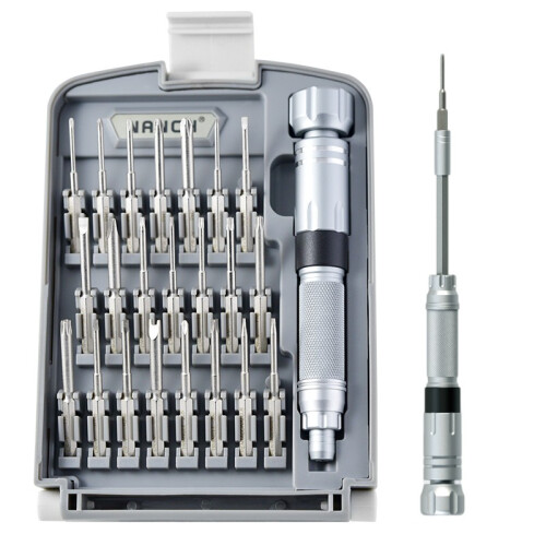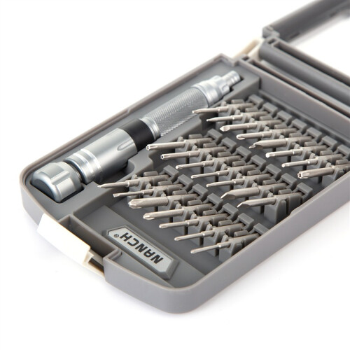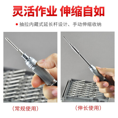 南旗出品的螺丝刀套装在国内很出名,这款型号为NQ220102的22合1精密螺丝刀组合,批头规格(22支): 十字:PH000 PH00 PH0 PH1 PH2 一字:SL1.5 SL2.0 SL3.0 SL4.0 梅花:T4 T5 T6 T8 T10 T15 六角:H1.5 H2.0 三角:2.5 五角:0.8 1.2 人字三角:2.5 U型:SP2 批头材料:台湾中钢6150H,硬度HRC52±2 手柄全金属全铝棒材铣手柄,去掉了传统组合工具的接驳延长杆,内藏式延长杆设计,手动自伸缩收纳。全铝氧化手柄。 盒子颜色:灰+白。南旗NQ220102螺丝刀套装,适合对手机、电脑、笔记本等进行维修,收纳有序,铝合金材质手柄带有防滑纹理,CR-V材质批头加长设计,内置延长杆方便实用,更适合深孔位操作。