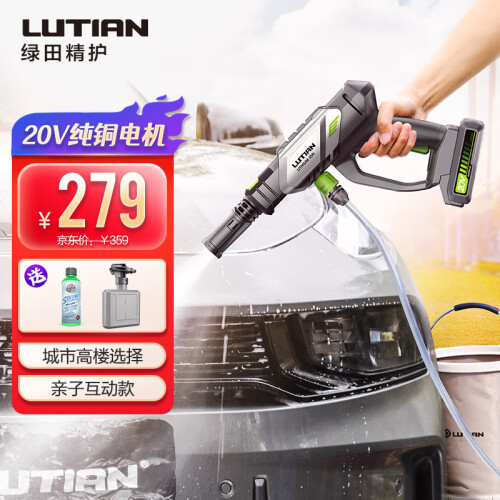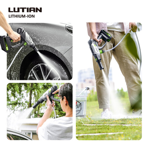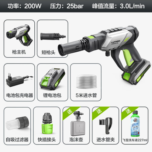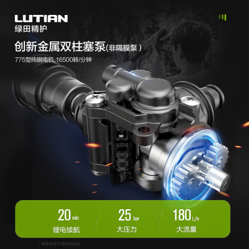 5节高容量锂电池,续航时间可达约20分钟IPX7防水等级,清洗更安全。搭载550型纯铜线电机动力强劲,峰值输出功率200W,许用压力达到25公斤,流量180升/时。在同级别机芯中算是非常高的,与电机搭配的是 套金属双柱塞泵,采用的国内高强度密封器, 吸水时间更快出水压力更猛。洗车、浇花、喷洒 功能面面俱到,得心应手。