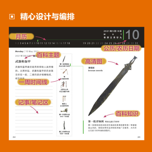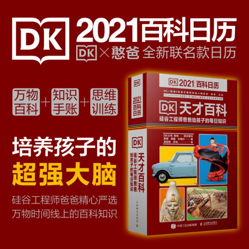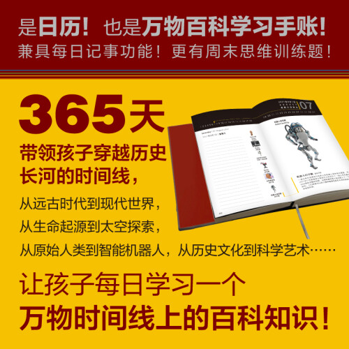 经DK正式授权,憨爸从海量的DK百科素材中,甄选出了给孩子的365个每日百科知识,汇总成册,并且进行了精心的设计和编排。全书共分为39个主题,从生命起源、人类起源、人类文明起源讲起,内容包含从生命诞生之初的地球火山到近现代的科技发展,一年之中纵览历史、生物、文化、科技、艺术等领域的百科知识,帮助孩子全方位地了解世界万物的发展历程。直观易懂的文字配以精美的高清插图,带领孩子穿越时空,从远古时代到现代世界,从原始人类到智能机器人,万物发展跃然纸上。周一至周六为百科知识点,周日为思维训练题,让孩子在学习万物发展时间线上的百科知识的同时,还可以进行思维训练。每日配有书写空间,兼具科普学习本及记事本的功能。适合5到12岁孩子,以及各年龄层对百科感兴趣的人。