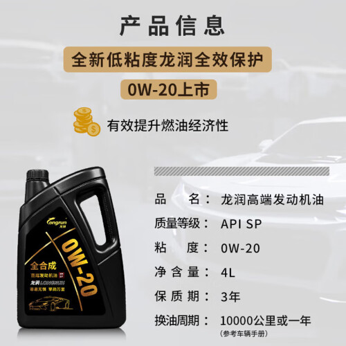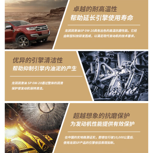 卓越的耐高温性 帮助延长引擎使用寿命,龙润润滑油SP0W20具有出色的高温抗磨性能。它经由新型科技研发而成,以满足现代发动机的技术要求。