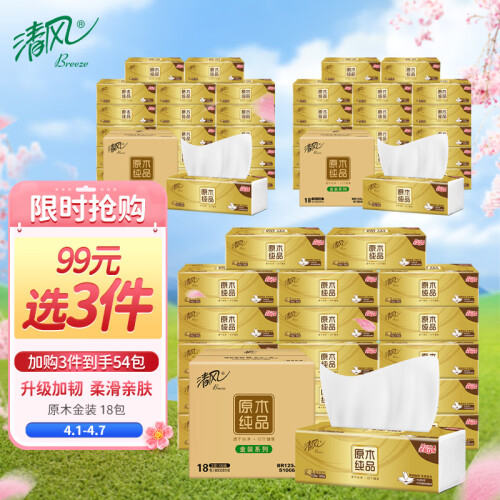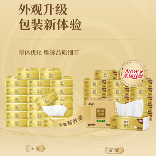 清风原木金装抽纸,柔韧升级,品质呵护,万千家庭的口碑之选;纸质柔韧升级,吸水力更大,柔韧兼备,湿水不易破;3层柔韧细滑,蓬松舒软,厚实与柔软的平衡体验;全程严控,更放心,不含可迁移性荧光增白剂;纤维紧实不掉屑不分层,纸质强韧,使用更放心。