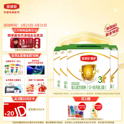 伊利是知名的国产奶粉企业,旗下的奶粉产品线比较丰富,金领冠是伊利销量top1的奶粉系列,奶源选自“黄金奶源带”新西兰,臻选1%专属牧场新鲜生牛乳,原奶经过伊利标准化、集约化的生产加工,转化为营养优质的奶粉。伊利金领冠以中国母乳为黄金标准,添加α+β专利蛋白,促进营养吸收,提高免疫力。含有的BID是来源于美国杜邦丹尼斯克的乳双歧杆菌和丹麦汉森的动物双歧杆菌,可以促进宝宝肠道健康。DHA、ARA和胆碱,有助于宝宝脑部发育,符合中国宝宝营养需求。