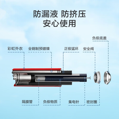 这款京造7号碱性电池不含汞、铅、铬等重金属,采用8种炫彩时尚配色,双阀门配合密封圈技术,防止锌氧化,持久存放;采用3个高密度锰环配合尼龙密封圈,防漏夜,镀镍钢带外壳材质保证电池外壳高强度受挤压也不易折损,使用更安心。