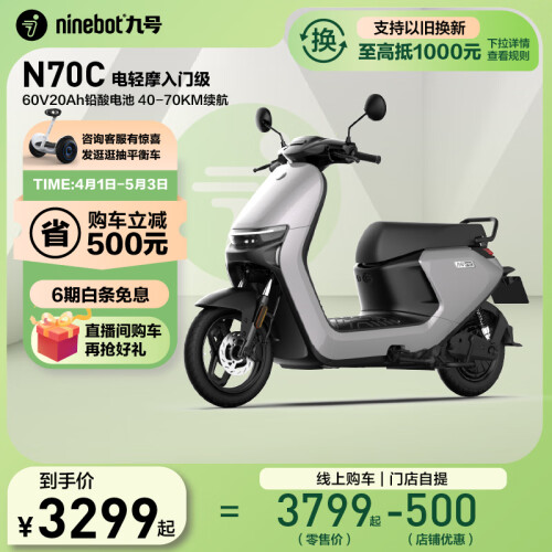 Ninebot 九号 N70C 电动摩托车,70KM续航,沉浸驾驭快感,远方不在话下! 22L超大储物空间。启动就领先,大功率直驱轮毂电机,搭配60V高电压铅酸,动力输出更强! 60V高电压平台/800W额定功率/1500W最大功率/80N.m轮_上扭矩/FOC矢量控制器/智能光LED矩阵式大灯,40000cd照明亮度, 10w小时使用寿命,25m照射距离。RideyGo !便捷升级: Airlock/多 用户系统/OTA自动更新/Knock-Knock/-键倒车。