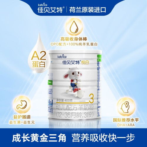 佳贝艾特(Kabrita)创立于1897年,是澳优·海普诺凯乳业集团旗下羊奶高端产品品牌,旗下主要的产品有新鲜羊奶、羊酸奶、羊乳酪、婴幼儿配方羊奶粉、妈妈羊奶粉,是较早推出婴幼儿羊奶粉的品牌。其推出的这款配方羊奶粉,选用荷兰奶源,为荷兰原装进口。采用羊乳蛋白配方,羊乳脂肪颗粒小,易于消化吸收。还添加了α-乳清蛋白、OPO结构脂、益生元、益生菌、DHA和ARA等多种营养成分,可满足孩子生长所需营养。