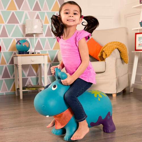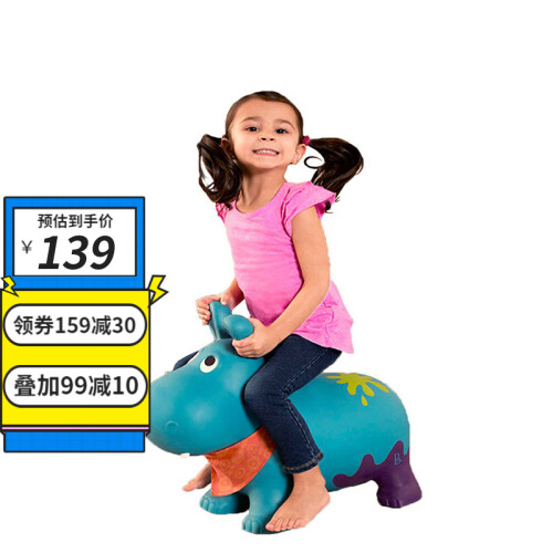 B.toys感统玩具品牌来自有119年悠久历史的加拿大玩具公司Battat,以其独特的”自然”配色、生动的形象及其引导式的教育玩法,风靡欧美市场。形象取自憨厚可掬的河马,蓝色身躯光滑圆润,一双呆萌的大眼尽显萌动生趣,脖前的红领巾为河马增添了几分俏皮。继承B.惯有的生动配色,符合小朋友审美。宝宝的专属坐骑,坐在上面拉风又安全。两只耳朵是宝宝的方向盘,用手捏挤,触感柔软。符合人体工学设计,坐骑舒适柔软,河马身体曲线优美,弹性佳。宝宝坐在上面玩耍时可利用脚部力量使河马弹跳起来,底部的四足保证了弹跳时的安全性。采用充气的方式,在不使用时方便收纳。硅胶材质,不含BPA、铅和塑化剂。