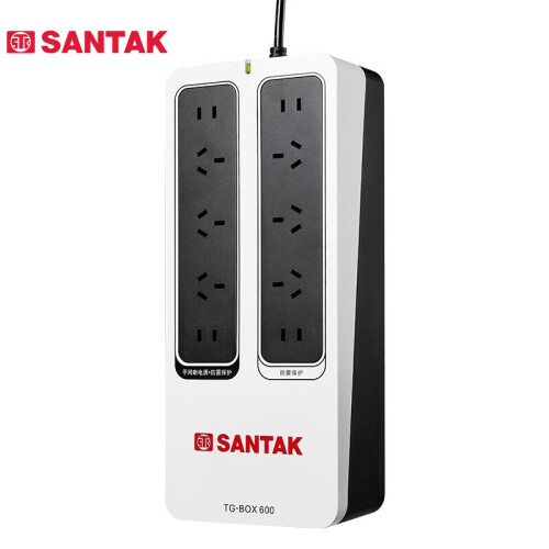 山特(SANTAK)TG-BOX600不间断电源插座,配置市电及不间断电源保护两组输出插座,每组包含两位双孔及三位三孔国标插座。两组插座总输出功率高于标称UPS功率,可达2000VA,满足家用环境下众多用电设备的需求。所有插座均配置有符合IEC61643-11标准的防雷保护模块,连接设备使用更放心。